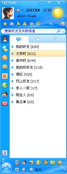 前天看到同学在用QQ2009,于是我也把QQ换成2009,给人一种耳目一新的感觉,比2008的简洁了许多,虽然有一点不习惯,但总体感觉还是很好的,截个图: