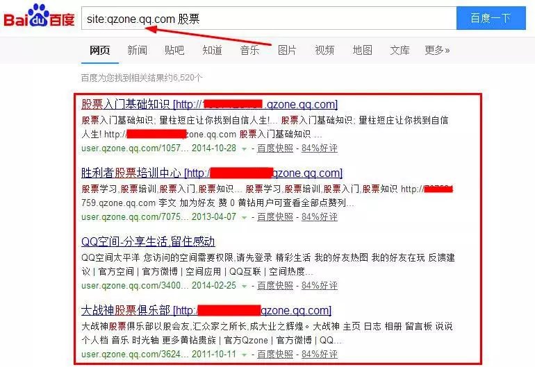 1、在百度搜索框里面输入:“site:qzone.qq.com 股票”,然后就会出现大量的与股票相关的QQ空间地址,然后把这些空间地址里面的QQ号搜集下来,如下图所示: