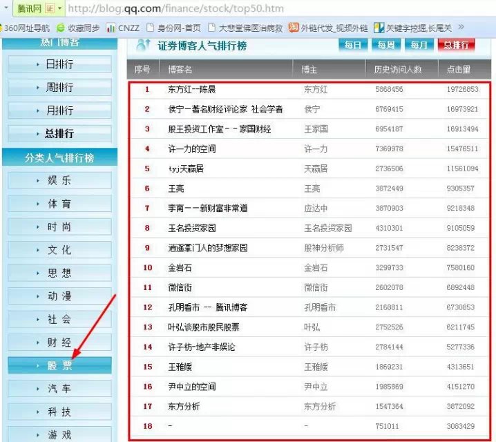 2、在浏览器地址栏里面输入网址:“http://blog.qq.com/index/top100.htm”,然后在左边的分类人气排行榜里面选择“股票”,里面有很多有关股票类专家的QQ数据,这些QQ空间访客每天的浏览量非常大,你只需要把这些专家的QQ 号码搜集下来,为下一步提取他们的访客做准备,如下图所示: