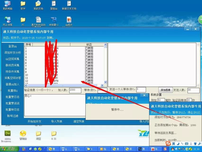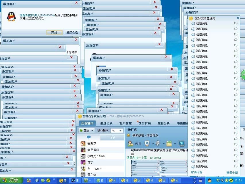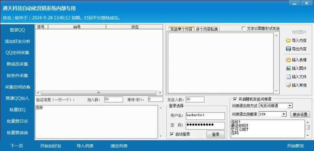 在这里推荐大家配合使用营销QQ好友添加器,实现全自动批量加好友操作,无需人工干涉,3个工号一天最多可发送1000次加好友请求。 下面是我们用营销QQ批量添加好友的操作演示截图: